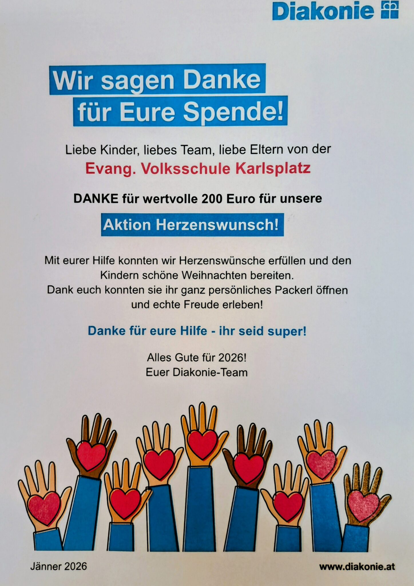 Dank der großzügigen Spenden bei unserer Adventfeier konnten wir die Diakonie mit dem Projekt „Aktion Herzenswunsch“ unterstützen.